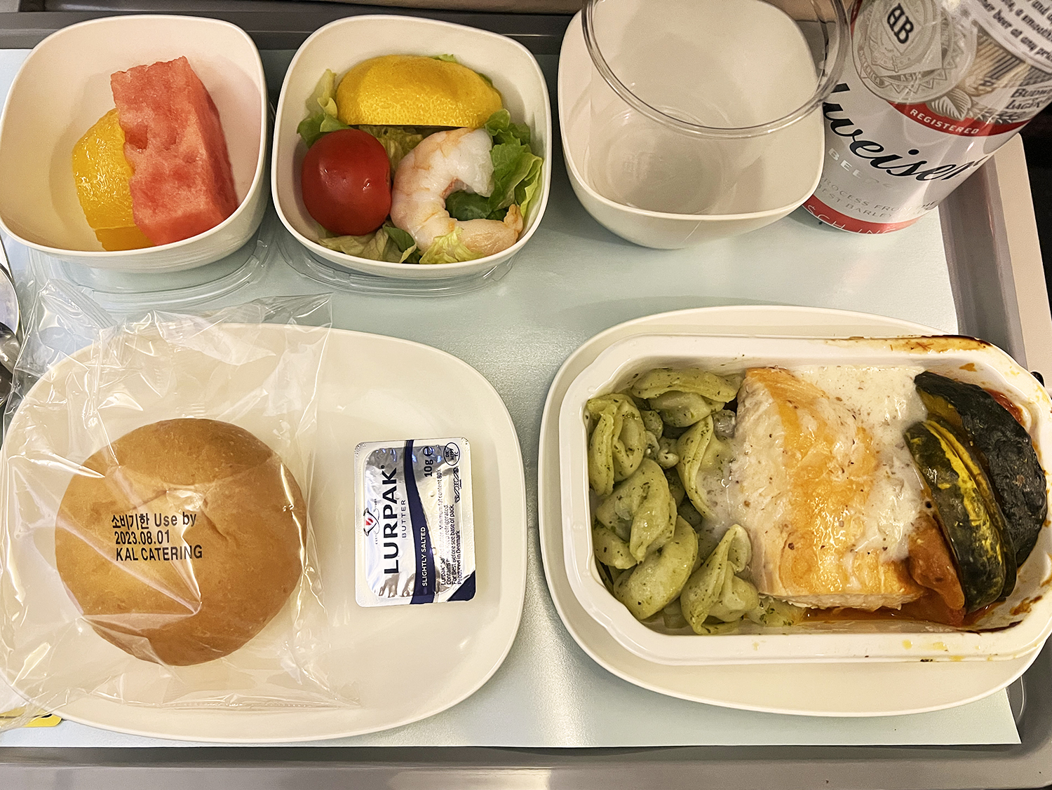 아스파라거스 아래에는 호박과 가지가 들어 있었습니다. 이 둘은 너무 짠 편이었어요. 새우, 가리비, 연어를 레몬즙과 함께 먹었습니다. 음식은 어떻습니까… 기내식 맛 그 이상도 그 이하도 아닙니다.