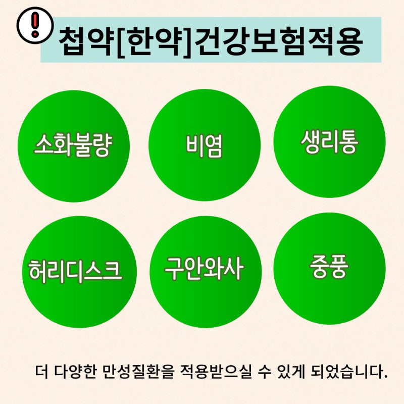정부는 올해 4월 말부터 비염, 기능성 소화기 질환, 생리통, 요추 추간판 탈출증 등 특정 질환에 대한 한방치료의 보험 적용을 확대했다. 본 보험은 ‘처약’이라는 한의학 치료법을 통해 운영되며, 한의학적인 접근을 통해 보다 많은 분들이 혜택을 누릴 수 있도록 하는 것을 목적으로 하였습니다.