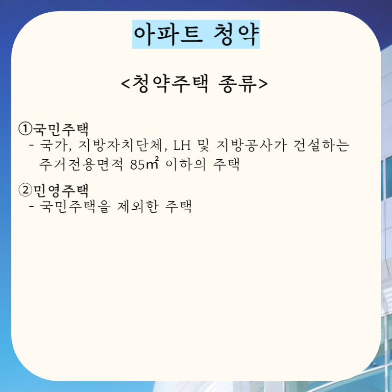 아파트 청약조건을 충족하는 국민주택이란 지방자치단체나 정부가 건설하는 전용면적 85㎡ 이하의 주택을 말한다. 정부가 지원하는 제도이다 보니 실제 공급가보다 가격이 낮아 경쟁률이 높다. 보통 20평 이하로 떨어지며 규제도 엄격하다.