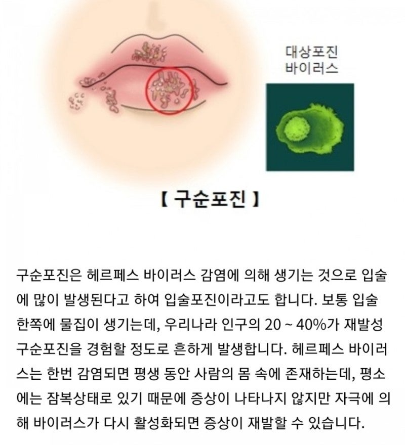 안녕하세요 건강상식을 알려주는 빅헤븐입니다 피곤할 때마다 입술에 물집이 생기는 사람이 있는데요 이때 의심할 수 있는 헤르페스 감염에 의한 구순포진 (입술포진)인데요 이런 입술포진의 원인 증상 진단 치료를 알아보도록 하겠습니다