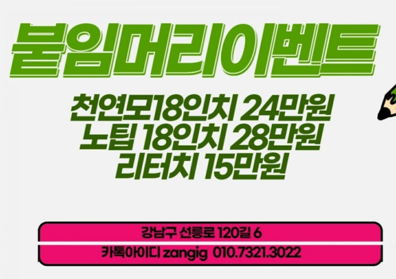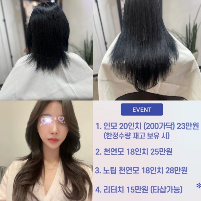 보샵 위치 : 서울 강북 4호선 수유역 1번 출구 방향 (도보 3분 이내) 한천로131길 17 2층 * 전용 주차장 * 강북 한천로131길 17 효성네오 인텔리안 서울특별시 주차 후 맞은편 건물 2층으로 오세요. ~ 영업시간 : 오전 10시 ~ 오후 9시 붙임머리 : 100% 인모, “천연생모” 사용 (염색+파마+가열기기 이용 가능) 붙임머리 종류 : 유팁 붙임머리 & 노팁 붙임머리 헤어 연장 길이 #18인치 머리 연장 인치 머리 연장 인치 머리 연장 인치 머리 연장 머리 연장 색상(일반 색상) 검정, 내추럴 블랙, 내추럴 브라운 다크 브라운, 초콜렛 브라운, 라이트 브라운, 라이트 블론드 등 12가지 색상 제공(표백) 스페셜 컬러) 블리치 백발, 아이보리, 화이트 베이지, 코토리 베이지, 밀크 베이지 핑크, 인디 핑크, 라이트 핑크, 체리 핑크, 바이올렛 핑크, 블루, 딥 블루, 믹스 블루, 그레이, 다크 그레이, 실버 그레이, 믹스 그레이. 민트~붙임머리제거&#붙임머리 리터치&#단발붙임머리&#뱅붙임머리&#포인트붙임머리&#가마붙임머리&#웨딩 붙임머리 브레이딩까지 25가지 컬러로 다양한 브릿지와 투톤 스타일을 만나보세요 헤어 익스텐션 3가지#스킬 브레이딩 헤어 익스텐션&#슬림 브레이딩 헤어 익스텐션&#럭셔리 브레이딩 헤어 익스텐션 (고객님의 머리와 모발에 꼭 맞는 맞춤형 헤어 익스텐션이 제작됩니다.) 헤어 익스텐션 이벤트 7번째 새로운 머리 6번 연장시 1회 증정품을 받으실 수 있습니다. “천연 붙임머리 무료팩”~#붙임머리 교육을 진행하는 보샵에서 #붙임머리 수업이 진행됩니다~