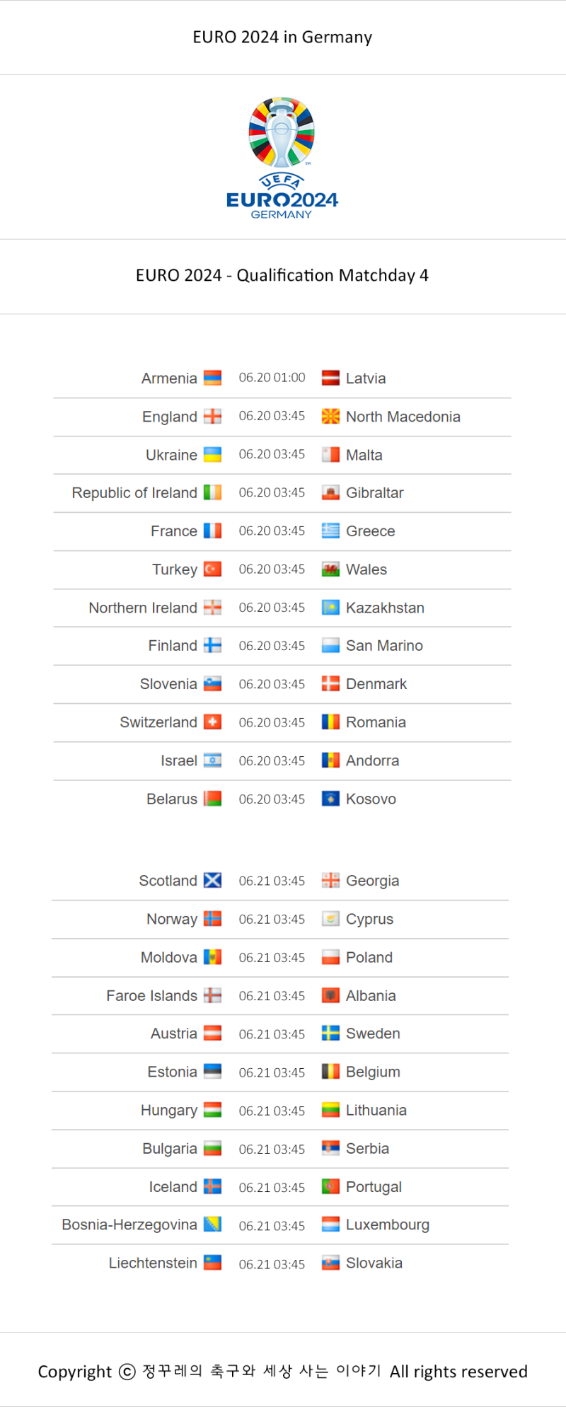 내년 6월 개막하는 UEFA EURO 2024는 17번째 유럽 축구 선수권 대회다. 아르헨티나와 브라질은 서로 다른 대륙이지만 FIFA 랭킹 TOP 10의 남은 자리와 상위권을 점유하는 국가 간의 경쟁인 만큼 자연스럽게 관심이 쏠린다. 클럽팀이 아닌 국가대표로 활약하는 스타 선수들의 모습을 볼 수 있으며, 어느 나라가 우승 트로피를 들어올릴지 예측하고 지켜보는 재미도 있습니다. UEFA EURO 2024 업데이트
