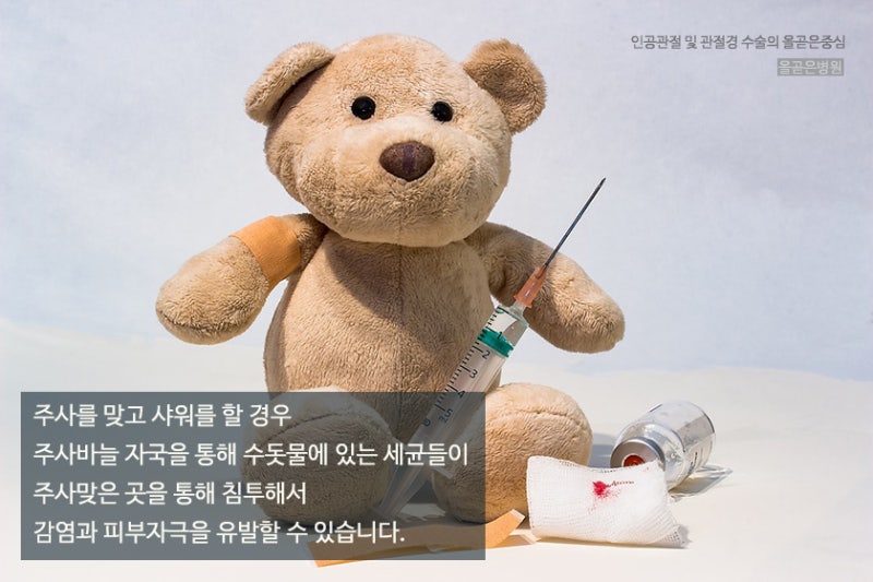침치료는 물론이고 독감 예방주사 등 예방접종도 맞을 경우 당일 샤워는 피하는 것이 좋다. 앞서 말했듯이 몸에 작은 상처가 있어 감염의 위험이 있으므로 샤워나 목욕은 자제해야 한다고 합니다. https://cdn.ppomppu.co.kr/zboard/data3/2021/0827/20210827103915_rlyvnxwa.jpg